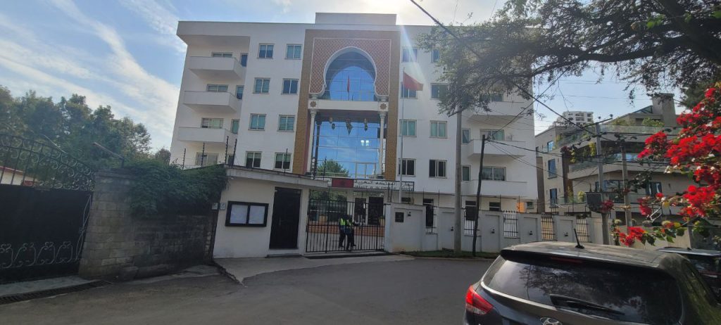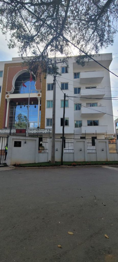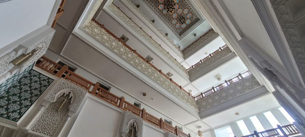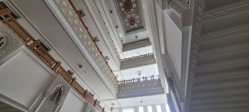 Nestled within the diplomatic enclave, the Moroccan Embassy stands as a simple yet elegant five-story rectangular edifice, its white facade punctuated by symmetrical square windows and a welcoming terrace. A pointed arch, adorned with intricate Islamic patterns characteristic of Moroccan design, emphasizes the central entrance. Stepping inside reveals a majestic four-story atrium, a breathtaking space showcasing detailed handcrafted frescos, exquisite ceiling soffits, and ornate handrails.